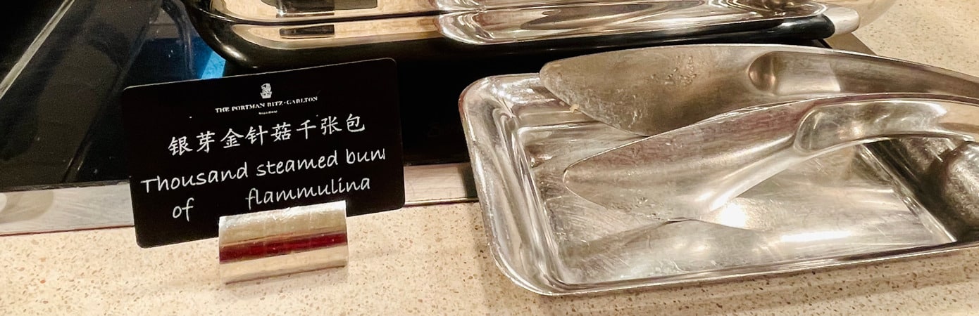 Das Portman Ritz-Carlton verwendet individuell gestaltete Etiketten, um die Speisen in seinem Restaurant Portman und in der Executive Lounge, die beide Buffets anbieten, zu präsentieren. Die Etiketten enthalten individuell gestaltete und gedruckte Karten, auf denen die Preise für Mahlzeiten und Artikel, die in der Ritz Bar & Lounge, in den Teestuben und Souvenirläden verkauft werden, angegeben sind.