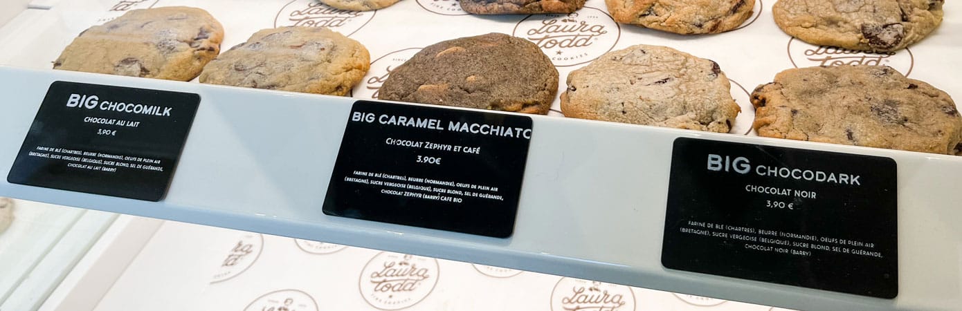Dank Edikio Price Tag, alle 13 Laura-Todd-Geschäfte haben eine identische und einheitliche Etikettierung für die rund 20 Produkte, die in jedem dieser Geschäfte verkauft werden. Bei jeder Neueröffnung wird ein Paket mit 20 x 3 schwarzen Etiketten mit weißem Aufdruck von der Zentrale von Laura Todd an das Personal vor Ort geliefert, um die Preise der Kekse in den verschiedenen Schaufenstern anzuzeigen. In der Zentrale werden dann Etiketten für saisonale Produkte und monatliche Kreationen erstellt. Das Kundenerlebnis ist also unabhängig davon, in welchem Geschäft des Einzelhandelsunternehmens Sie sich befinden, das gleiche.