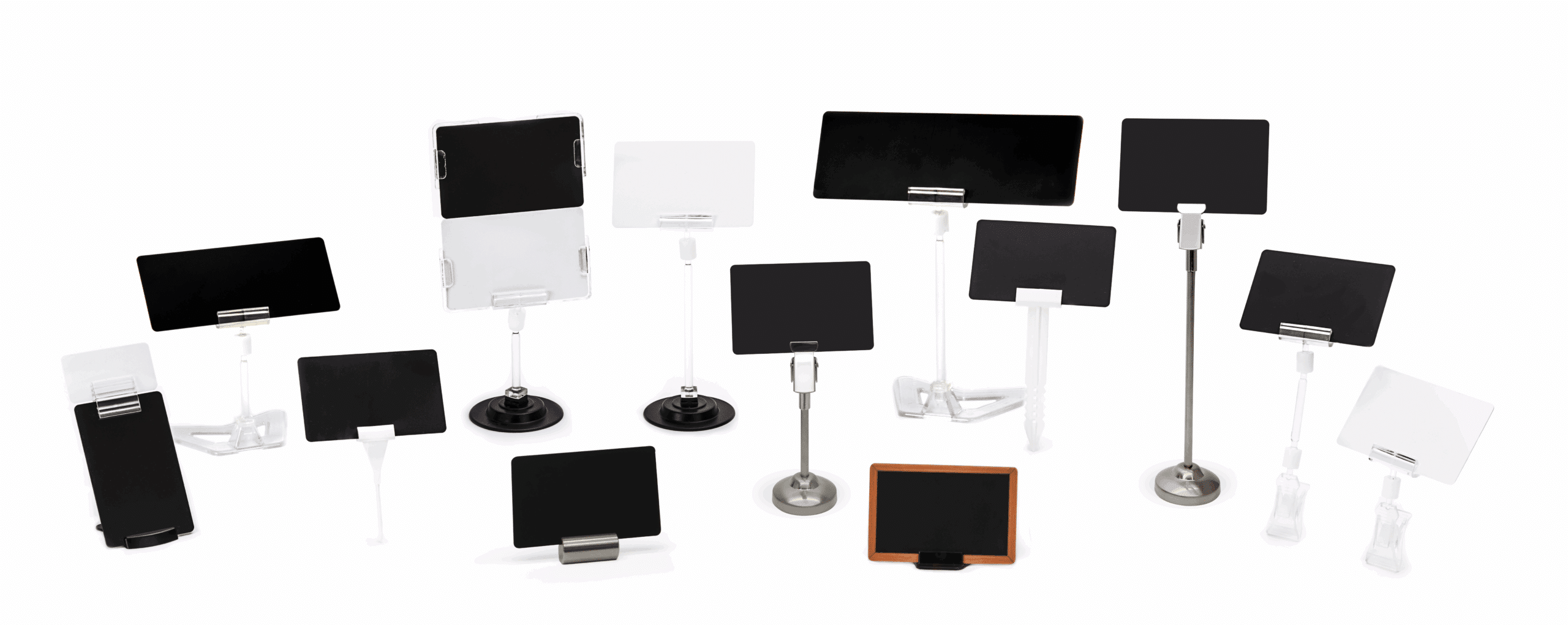 Flachklemmenhalter, die aufgestellt oder eingeschoben werden können, magnetisch, breit, schmal: Es gibt jede Menge Auswahl, um Ihre Stände zu schmücken!